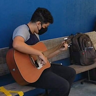 O “Momento especial CAM” contou com as seguintes participações: do professor de Geografia, Diogo Soares (violão e voz, professor, aluno Gabriel Manzano Coradi (violão - foto), além dos demais alunos e professores.