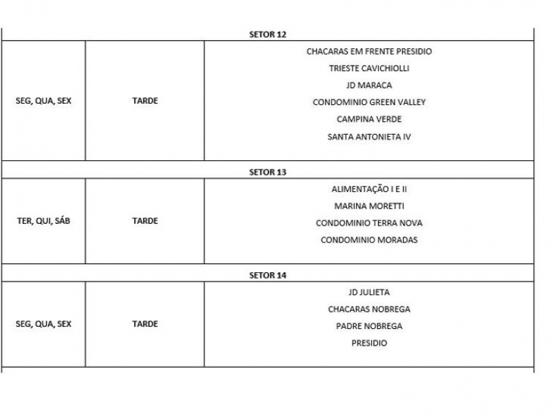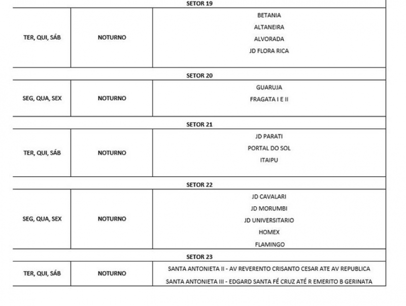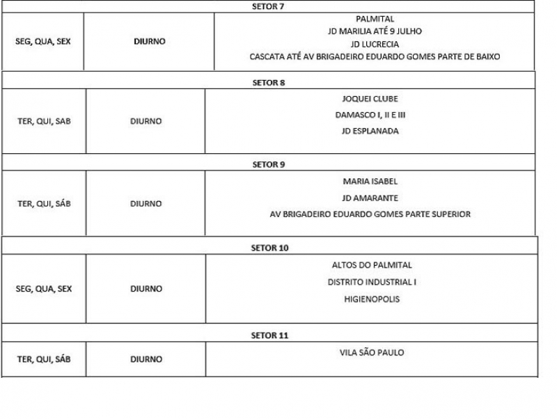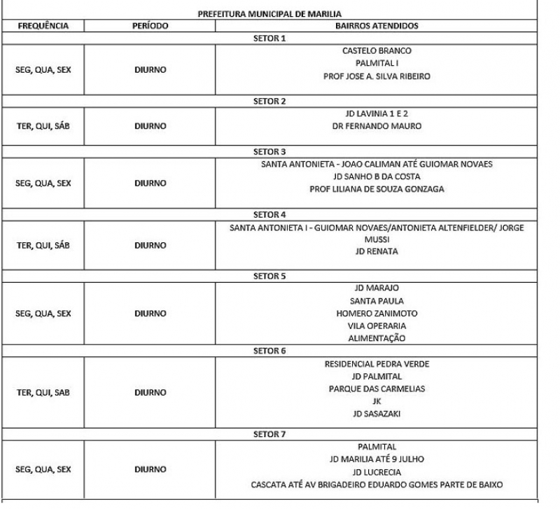 A Prefeitura faz a coleta em 60% da cidade. De acordo com o esquema definido pela administração, ficou definido o serviço nos bairros atendidos pela prefeitura e no chamado setor auxiliar, que faz apoio a Distritos, supermercados, hospitais, condomínios, chácaras e outros.