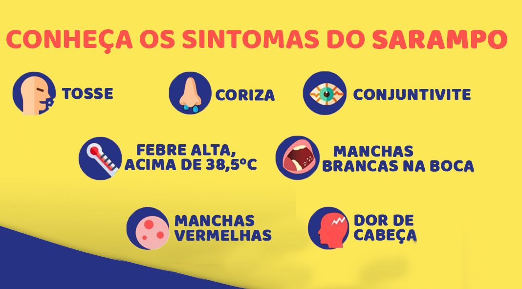 Os principais sintomas incluem: febre alta; manchas vermelhas pelo corpo; tosse; coriza (nariz escorrendo); e conjuntivite (olhos vermelhos e lacrimejantes).