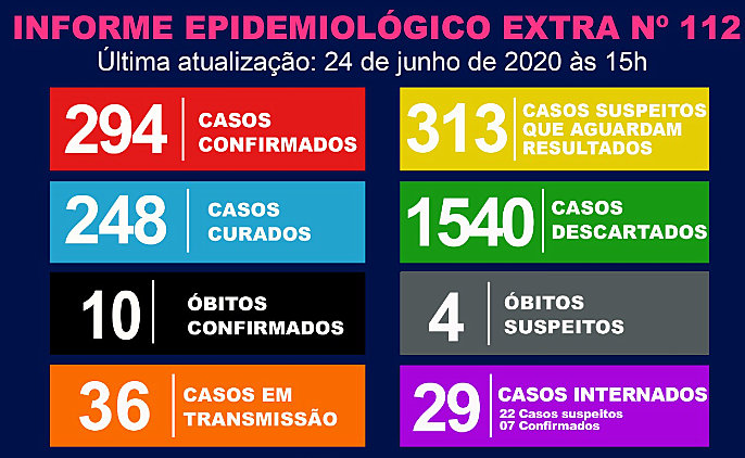 informa através de um Boletim Epidemiológico Extra, mais dois óbitos por Covid-19 confirmados no início da tarde desta quarta-feira, dia 24. Agora a cidade soma dez óbitos pela doença – pela manhã já havia sido informado o óbito de um senhor de 81 anos.