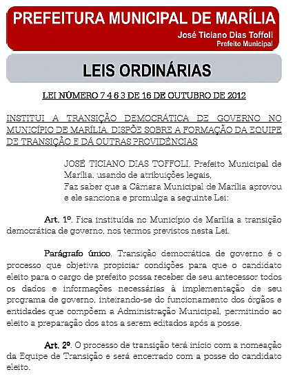 LEI OBRIGA TRANSIÇÃO – A transição entre Vinicius e Daniel é uma exigência da própria lei 7. 4 6 3, sancionada em outubro de 2012 (trata da “transição democrática”). O problema é que existe uma lacuna sobre o prazo máximo para ser colocada em prática.  Daniel está se baseando na data em que o ex-prefeito Ticiano Toffoli iniciou a transferência de informações para Vinicius (em 26/10/2012). Portanto, já venceu em relação a Vinicius.