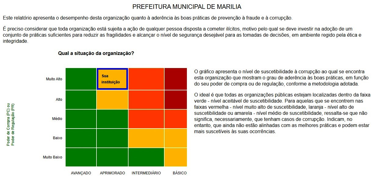 O Programa tem por objetivo demonstrar o nível de suscetibilidade ao qual se encontra o Município e o seu grau de aderência às boas práticas. A nota obtida pelo Município demonstra que Marília está alinhada às boas práticas contra a fraude e à corrupção.