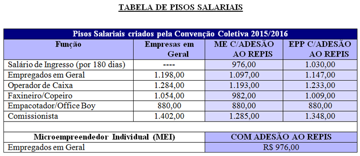 O índice de reajuste para os salários foi de 9,88% (confira tabela abaixo), e as diferenças salariais dos meses de setembro/2015 a abril/2016, compensadas as eventuais antecipações, poderão ser pagas em até cinco parcelas, bem como os encargos de natureza trabalhista, previdenciária e tributária que poderão ser recolhidos na mesma época do pagamento dessa diferença salarial.