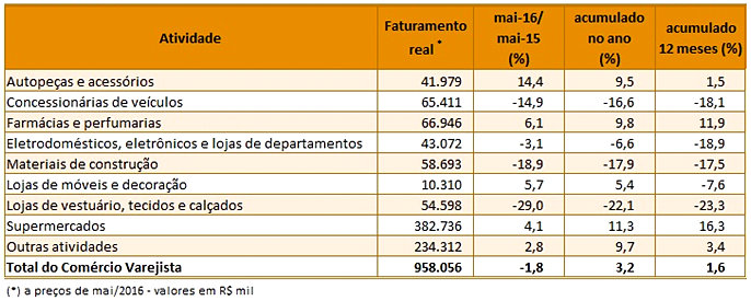 Apesar da retração, cinco das nove atividades pesquisadas apresentaram crescimento em relação a maio do ano passado. As altas mais expressivas foram vistas nos setores de supermercados (4,1% e contribuição de 1,5 ponto porcentual (p.p.) para o resultado geral), de outras atividades (2,8% e influência de 0,6 p.p.) e de autopeças e acessórios (14,4% e contribuição de 0,5 p.p.).