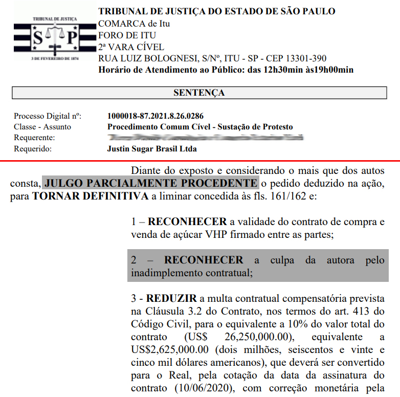 Todavia, a empresa não teria cumprido o acordo, levando à demanda judicial. Após quase cinco anos de discussão nos tribunais, finalmente veio a sentença definitiva, favorável a Sugar Brazil.