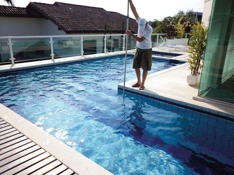 A limpeza da piscina deve ser feita no mínimo duas vezes por semana. A cloração assegura que a piscina fique livre das bactérias, como vírus e fungos. Já os algecidas e os floculantes servem para eliminar as algas.