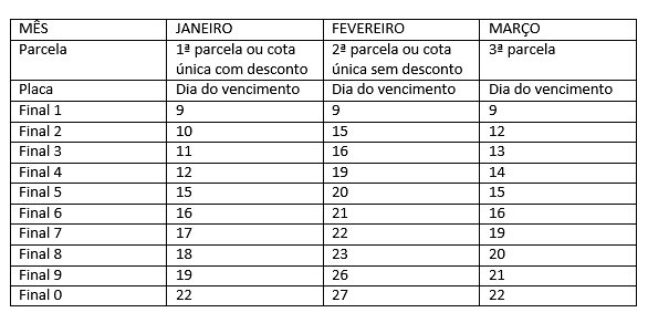 A data de vencimento, neste caso, vai depender do número final da placa. Há ainda a possibilidade de pagamento à vista, na data de vencimento da primeira parcela, com desconto de 3%.