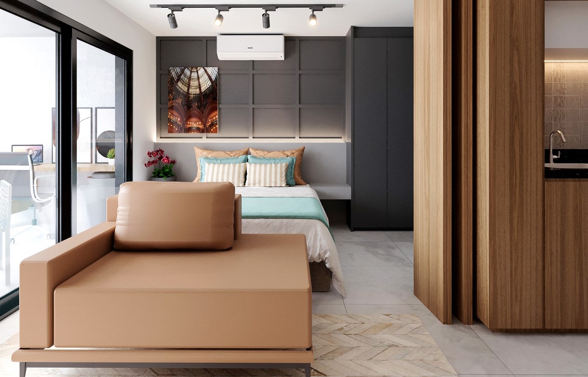Os apartamentos compactos, de apenas um ambiente, conjugando cozinha, sala de estar e dormitório, se completam com uma varanda (decoração sugerida pela arquiteta Bia Menin).
