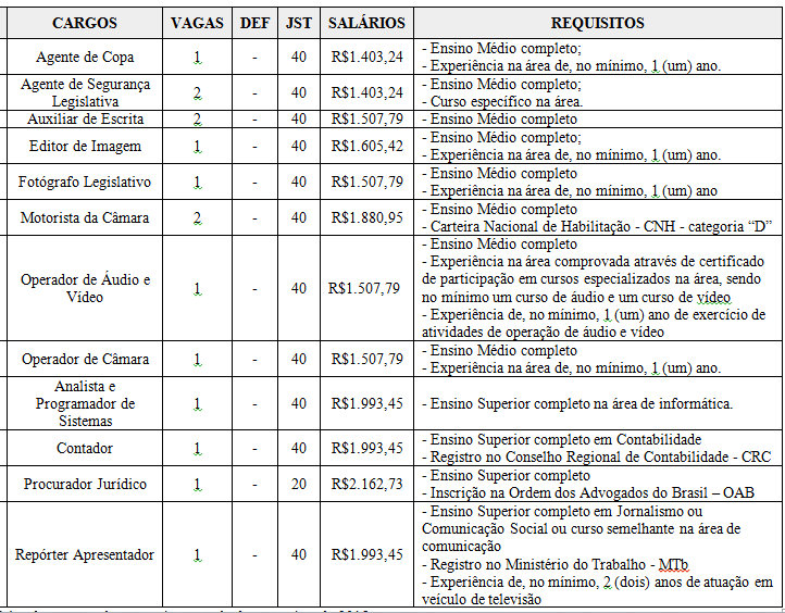 O concurso da Câmara oferece vagas para as carreiras de agente de copa, agente de segurança legislativa; analista e programador de sistemas; auxiliar de escrita; contador; editor de imagem; fotógrafo legislativo; motorista da câmara; operador de áudio e vídeo; operador de câmara; procurador jurídico; e repórter apresentador.