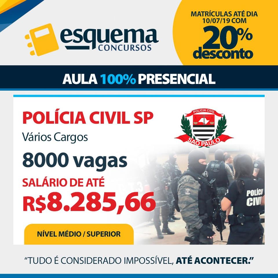 OUTRAS VAGAS - Há ainda concursos em andamento para preencher 2.750 vagas para a Polícia Civil. São 250 vagas para delegados, 600 investigadores, 800 para escrivães, 300 agentes de telecomunicações e 200 papiloscopistas, 400 agentes policiais e 200 auxiliares de papiloscopistas.