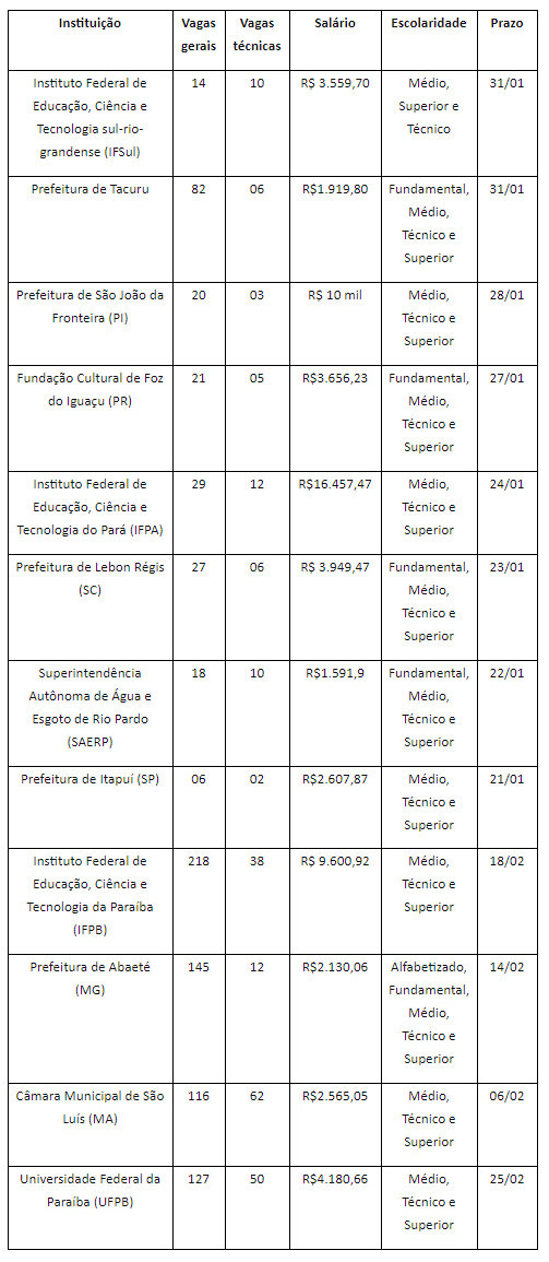 Confira a relação dos processos seletivos: