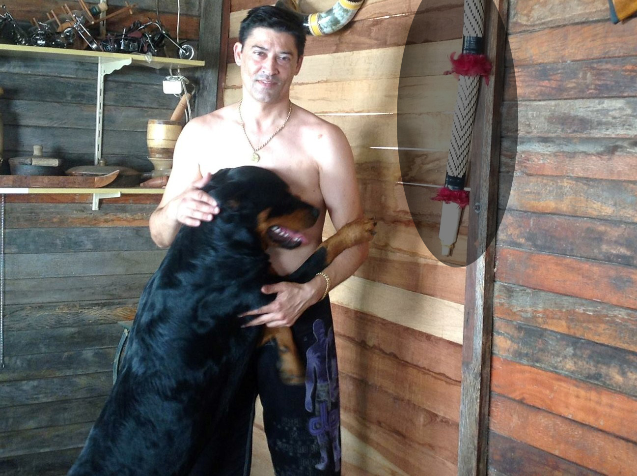 Na foto, Silvio aparece ao lado da espada tipo samurai com a qual foi assassinado.