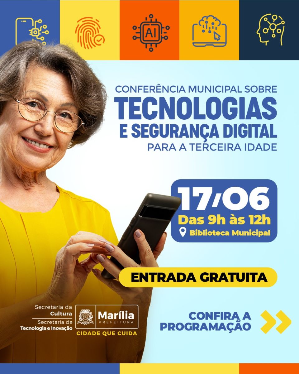 Você, com 50 anos ou mais, sabe fazer compras pela internet de forma segura? Diferenciar um site falso de um verdadeiro? Identificar mensagens e ligações suspeitas? Estas e outras questões serão discutidas e ensinadas na Conferência Municipal Sobre Tecnologias e Segurança Digital Para a Terceira Idade, que será realizada nesta terça-feira (dia 17), das 9h às 12h, no auditório da Biblioteca Municipal, na rua São Luiz, 1295. A entrada é gratuita.