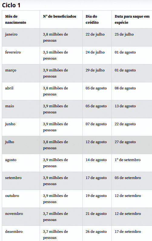 Assim, nascidos em janeiro recebem no dia 22; em fevereiro, em 24 de julho; em março, 29 de julho; em abril, 31 de julho; em maio, 5 de agosto; em junho, 7 de agosto; em julho, 12 de agosto; em agosto, 14 de agosto; em setembro, 17 de agosto; em outubro, 19 de agosto; em novembro, 21 de agosto; e em dezembro, 26 de agosto. O saque em dinheiro será entre os dias 25 de julho e 17 de setembro.