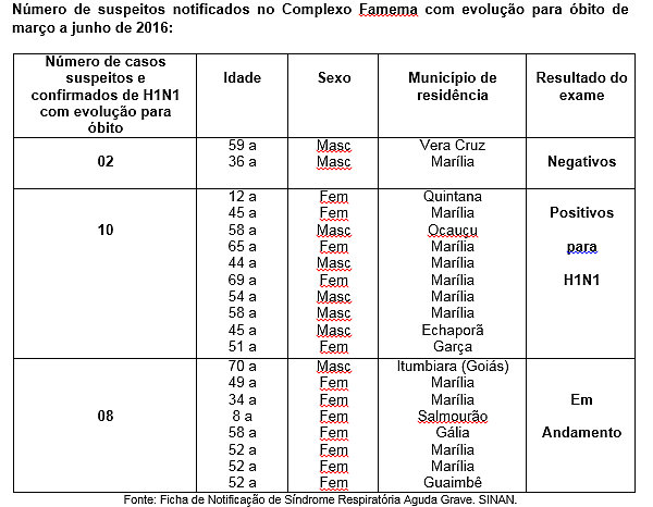 Em apenas 15 dias, o Serviço de Vigilância Epidemiológica (SVE) do Complexo Assistencial Famema (Faculdade de Medicina de Marília) notificou 12 novos casos suspeitos de gripe H1N1 (Síndrome Respiratória Aguda Grave), com mais uma morte (20 no total). Portanto, desde o começo do ano até agora são 101 suspeitos, sendo que quatro pessoas permanecem internadas no Hospital das Clínicas.