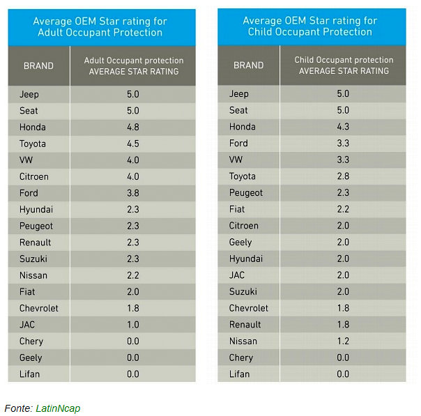 O Latin NCAP (Latin New Car Assessment Programme - um programa de avaliação de segurança automotiva) publicou o primeiro ranking de desempenho em segurança das marcas automotivas na América Latina.