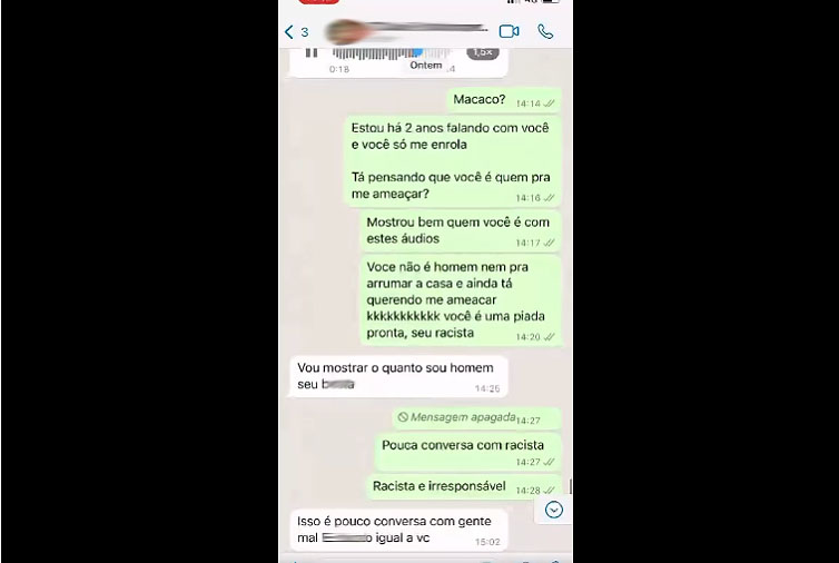O homem ficou irritado e respondeu, em tom de ameaça, que iria "dar um pau" nele e iria até a porta da casa mostrar o quanto "é homem". O empresário ainda mandou áudios xingando o arquiteto de "vagabundo" e "macaco".