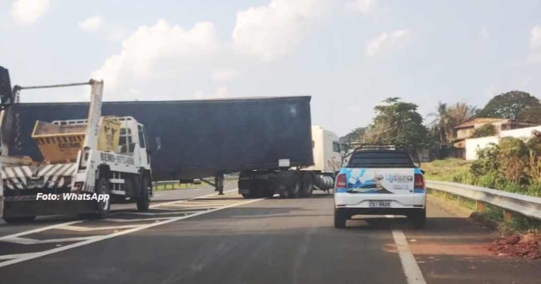 O acidente ocorreu no sentido capital - interior, logo após a base da Polícia Rodoviária. Por motivos que ainda estão sendo apurados, o motorista da carreta perdeu o controle e o veículo deu o famoso "L" (ficou de lateral).