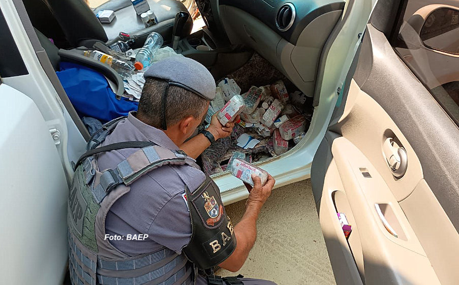 Embora a primeira suspeita fosse de tráfico de drogas, os policiais tiveram que fazer uma vistoria minuciosa até descobrir fundos falsos no assoalho do carro.