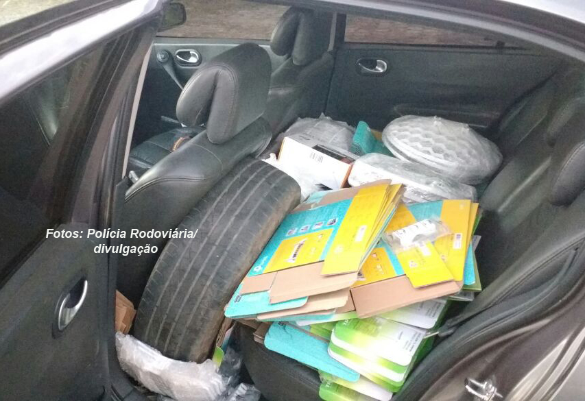 Na vistoria, os patrulheiros não tiveram dificuldades para encontrar o contrabando porque as mercadorias estavam espalhadas pelo porta-malas e também no banco traseiro.