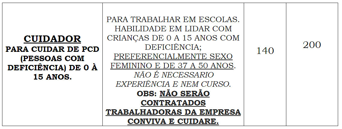 O órgão não deu mais detalhes e nem respondeu ao e-mail enviado pelo Visão Notícias sobre mais detalhes das vagas oferecidas e nem sobre um requisito curioso que consta no edital: "não serão contratados trabalhadores das empresas Conviva e Cuidare", o que poderia ser uma espécie de discriminação. Serão encaminhados 200 currículos para serem analisados pela empresa que procurou o PAT.