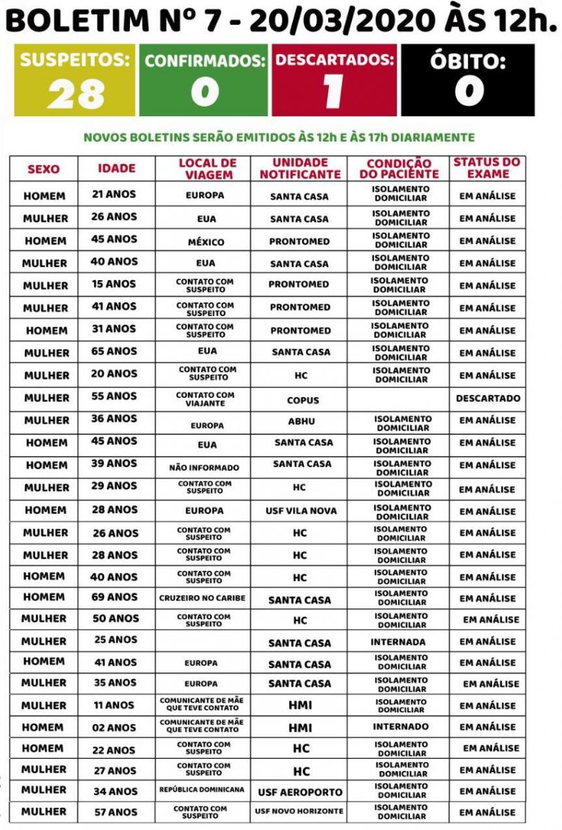 De acordo com as informações oficiais, dois pacientes que estavam internados (mulher de 25 anos e homem de 40 anos) foram liberados para o isolamento social. Dos 28 casos, duas pessoas ainda permanecem internadas na Santa Casa (mulher de 25 anos) e no Hospital Materno-Infantil (um menino de apenas dois anos).