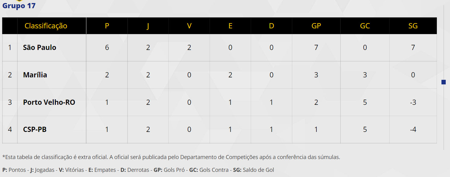 Na outra partida do grupo, o São Paulo venceu o CSP, da Paraíba, por 4 a 0, e garantiu a classificação para a segunda fase da Copinha com uma rodada de antecedência.