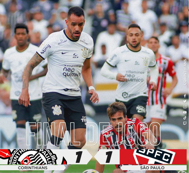 Em um clássico movimentado, Corinthians e São Paulo empataram por 1 a 1, neste domingo (22) na Neo Química Arena, na capital paulista, em duelo válido pela 7ª rodada do Campeonato Brasileiro.