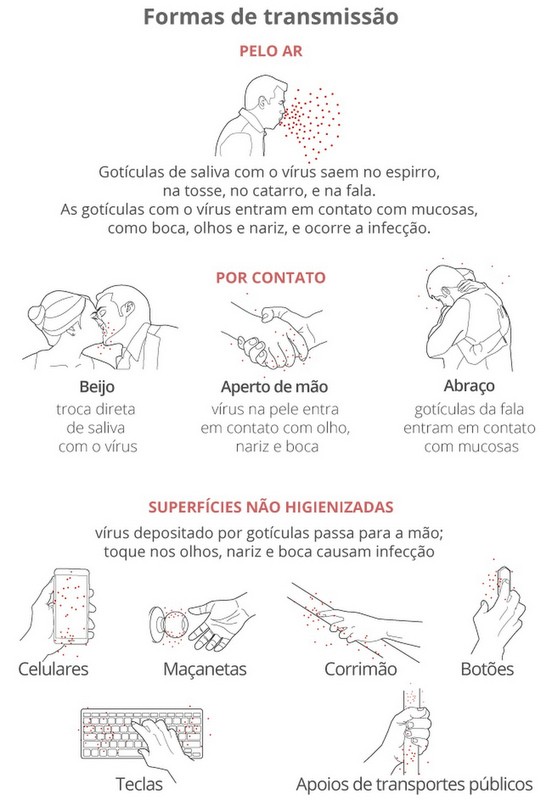 Estas gotículas com o vírus podem estar presentes no ar, ao serem expelidas, ou podem estar sobre superfícies contaminadas, como o rosto ou mãos, e objetos, como maçanetas, botões de elevador, corrimão, e apoios em transporte público, por exemplo.