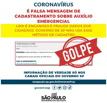 O Governo de São Paulo não usa esse tipo de método para fazer cadastro nem tampouco para liberar recursos. Todas as medidas adotadas para enfrentamento à epidemia do novo coronavírus são divulgadas nas redes sociais e nos canais oficiais.