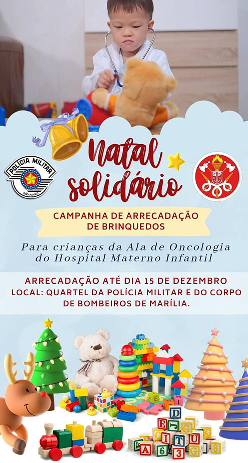 Com objetivo de proporcionar um Natal mais alegre às crianças que estão em atendimento no setor de Oncologia do Hospital Materno Infantil de Marília, o 10° Grupamento de Bombeiros, em parceria com o 9° Batalhão da Polícia Militar, está realizando uma campanha de arrecadação de brinquedos.