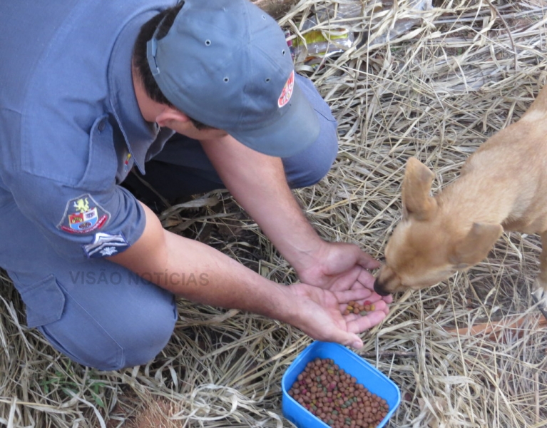 Primeiro os bombeiros tentaram laçar o animal, atraindo ele com ração, porém a cadelinha era rápida: comia e corria.