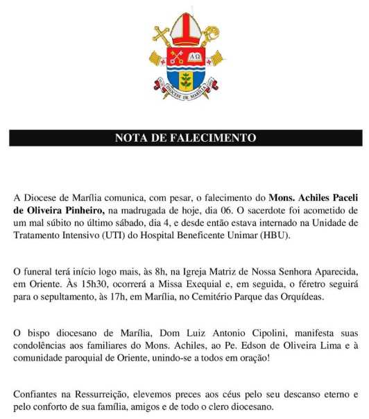O bispo diocesano, Dom Luiz Antonio Cipolini, manifestou pesar e condolências à família do Monsenhor Achiles, ao padre Edson de Oliveira Lima e à comunidade paroquial de Oriente, unindo-se em oração por sua alma.