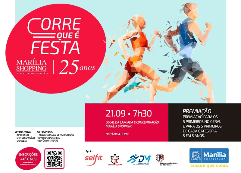 Como parte da programação comemorativa pelos seus 25 anos de atuação, o Marília Shopping realiza no dia 21 de setembro, a corrida de rua “Corre que é Festa”. O evento é uma oportunidade de reunir a comunidade em torno de um propósito saudável e solidário, incentivando a prática esportiva.