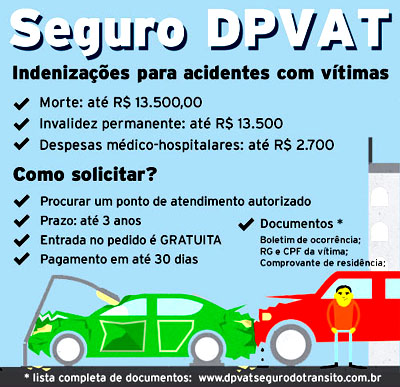 O DPVAT - Seguro Obrigatório de Danos Pessoais Causados por Veículos Automotores de Vias Terrestres foi criado por lei federal em 1974. Indeniza por morte ou invalidez (parcial ou total) permanente e reembolsa despesas comprovadas com atendimento médico-hospitalar.
