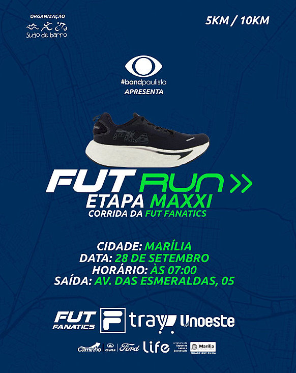 Marília será palco de mais um grande evento esportivo em 2025. No dia 28 de setembro, acontece a FutRun – Etapa Maxxi, quarta prova do circuito promovido pela Band Paulista. A largada será às 7h, em frente à Emdurb, na Avenida das Esmeraldas, reunindo atletas de Marília e região em um percurso de 5 km e 10 km.