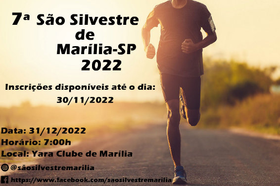 Marcando o encerramento do ano, no dia 31 de dezembro Marília vai realizar a sétima edição da sua tradicional Corrida de São Silvestre. As inscrições, embora gratuitas, precisam ser feitas pelos corredores.
