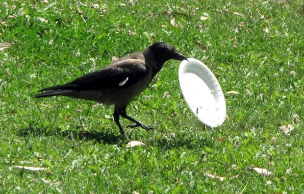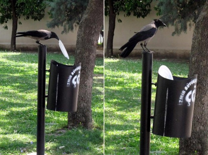 Um corvo fez sucesso nas redes sociais após ser fotografado pegando um prato de plástico que estava no gramado de um parque em Izmir, na Turquia, e colocando, em seguida, em uma lixeira.