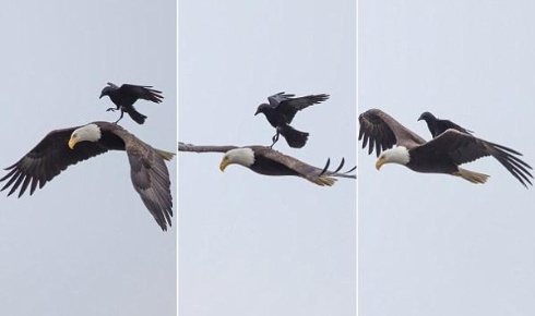 Um corvo pra lá de folgado foi fotografado no ar pegando carona nas costas de uma águia americana.