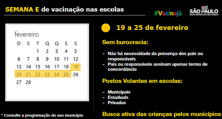 A Secretaria de Estado da Educação irá disponibilizar às escolas neste período para que as equipes de vacinação dos municípios possam ampliar suas estratégias de vacinação.