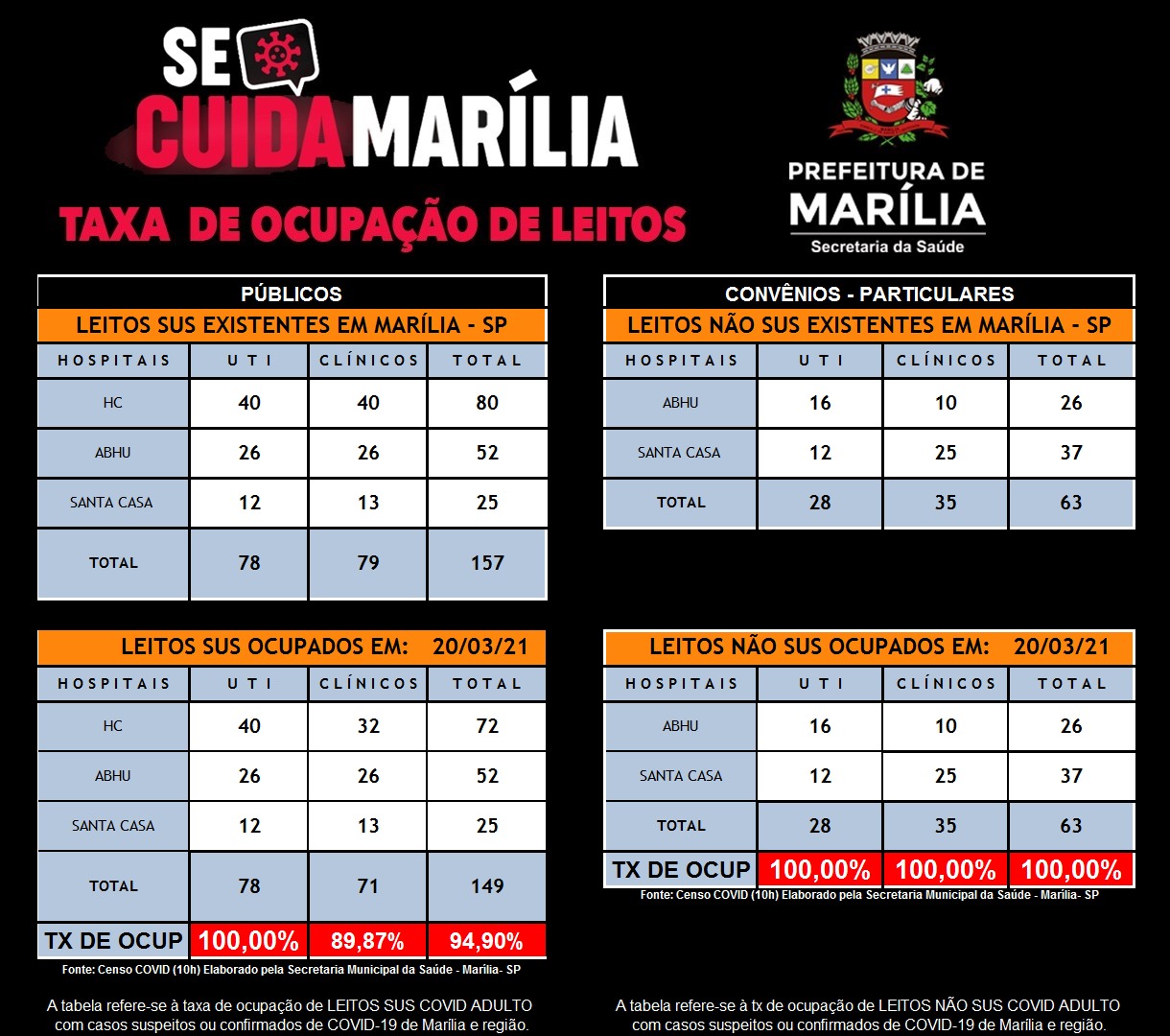 Já em Marília, os leitos de UTI SUS e particulares/convênios voltou a atingir 100% de ocupação.