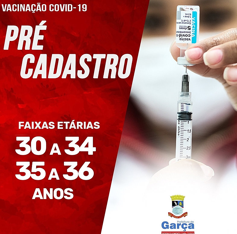 Também está aberto no site oficial da Prefeitura o pré-cadastro para garcenses com idades de 35 e 36 anos. As inscrições para esta faixa etária seguem até o dia 25 de julho. Faça sua inscrição clicando aqui.