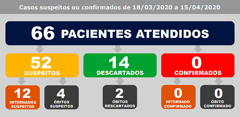 No caso específico do COVID-19, a informação oficial é de que desde o dia 18/03 até ontem (dia 15 - ver tabela), foram feitos 66 atendimentos, com 52 suspeitos e 14 descartados. Além disso, estão em investigação quatro óbitos e duas mortes foram descartados.