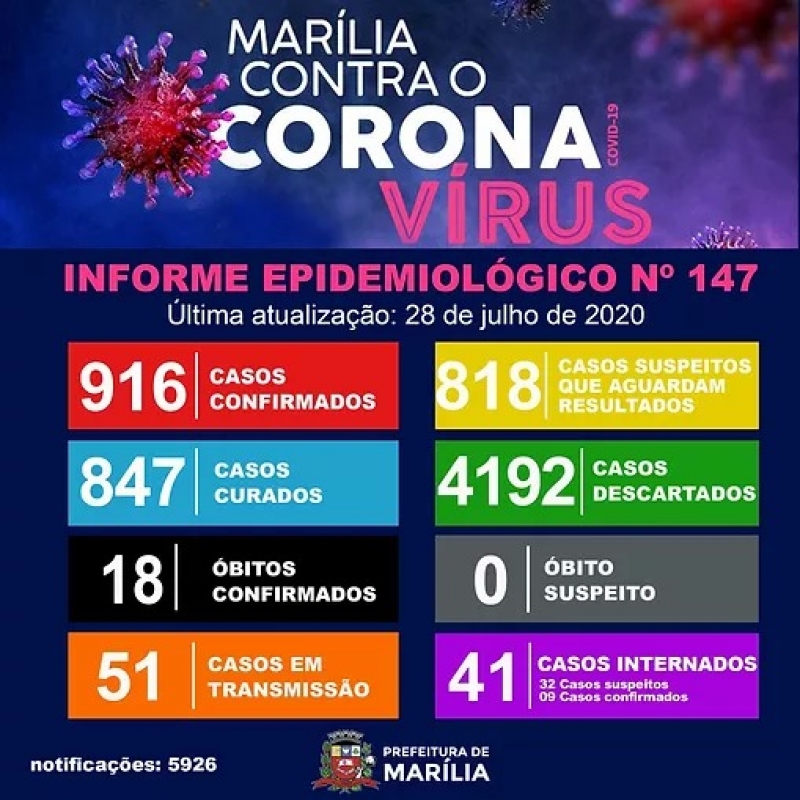 Boletim epidemiológico divulgada na manhã desta terça-feira, 28 confirma 916 testes positivos da doença desde o início da pandemia em Marília. São 818 casos suspeitos que aguardam resultado.
