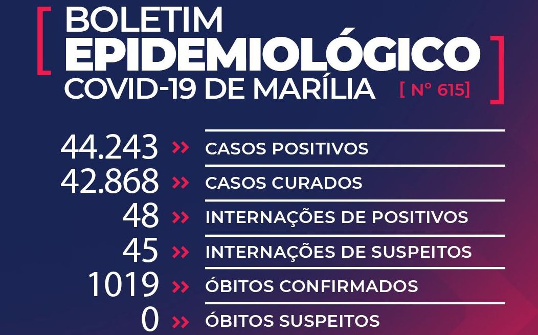 Marília tem agora 44.243 exames positivos, dos quais 42.868 já se recuperaram da doença. São 1.019 óbitos confirmados, três a mais que ontem.