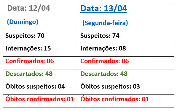 O número de mortes suspeitas, que estava em quatro (no fim de semana) caiu para três nesta segunda. Os casos suspeitos subiram de 70 para 74 aguardando resultado dos exames. A cidade permanece com seis confirmações e um óbito pela doença.