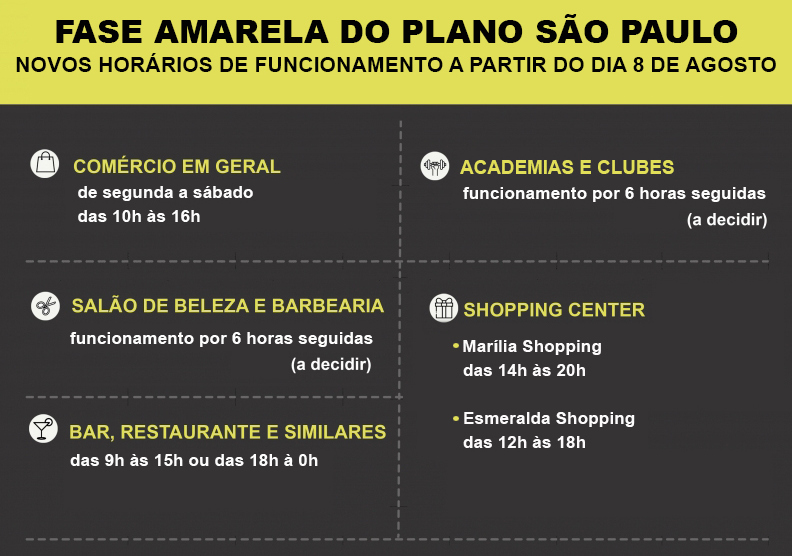 De uma forma geral, já a partir deste sábado, dia 8, o comércio funcionará das 10h às 16h, de segunda a sábado; o Marília Shopping ficará aberto todos os dias das 14h às 20h, inclusive aos domingos; e o Esmeralda Shopping das 12h às 18h também de segunda a domingo.