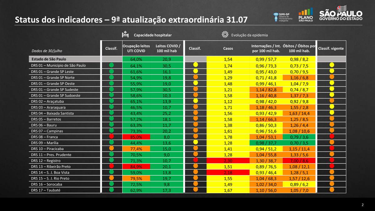 Os indicadores do Plano São Paulo, informados nesta sexta-feira, em mais uma atualização pelo Governo Estadual, mostram que a Região de Marília tem os melhores índices de todo o Estado no combate à pandemia da Covid-19, levando-se em conta os critérios de avaliação – capacidade hospitalar (dois índices) e evolução da epidemia (três).