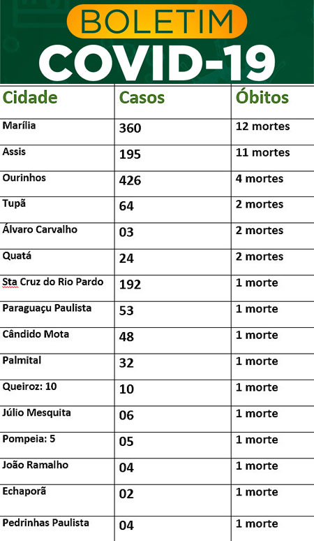 Com mais dois óbitos registrados hoje em Assis, a região de Marília totaliza agora 1.720 casos positivos e 43 mortes por covid-19. A região de Bauru, por exemplo, tem o tripo de casos e de mortes: 5.762 exames positivos e 148 óbitos.