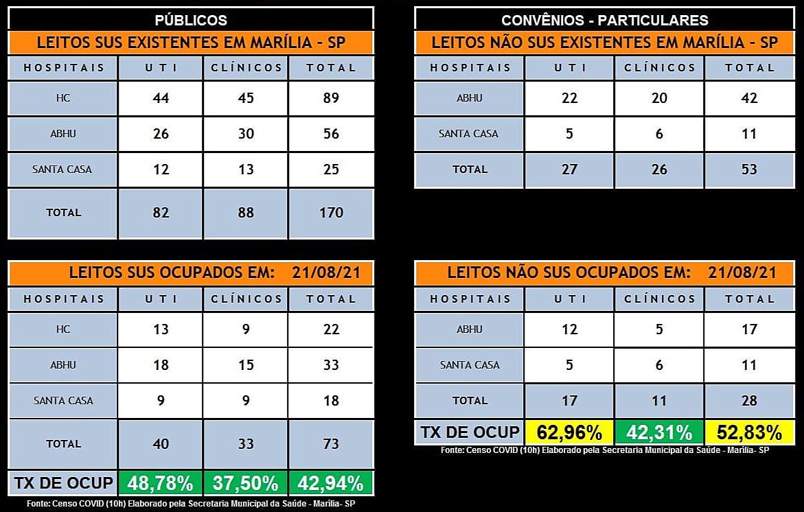 No caso dos hospitais particulares/convênios, a taxa de ocupação é um pouco maior: dos 27 leitos de UTI, 17 estão ocupados (62,96% - faixa amarela) e, clínicos, 11 dos 26 estão ocupados (42,31% - faixa verde).